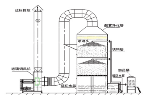 通風中需處理的廢氣,由玻璃鋼離心風機壓入噴淋塔之進氣短后,垂直向上與噴淋段自上而下的吸收液起中和反應,使廢氣濃度降低,然后繼續向上進入填料段,廢氣在塑料球打滾再與吸收液起中和反應,使廢氣濃度進一步降低后進入脫水器段,脫水液滴,凈化后達到排放標準。